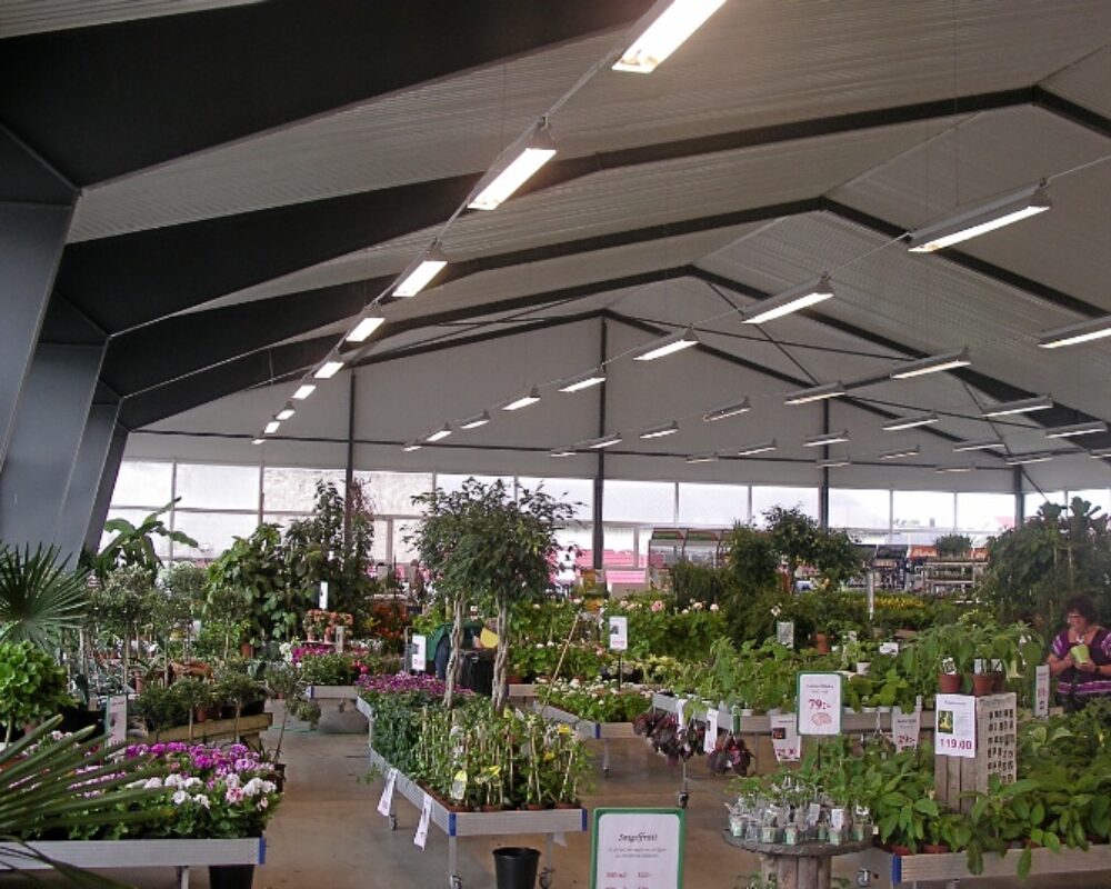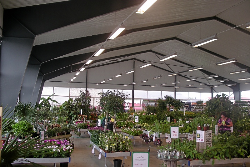 I ett växthus är det bra med mycket öppna ytor och då passar Tectums typ av byggnader, utan invändiga pelare, mycket bra. Denna hallbyggnads fasad är näst intill helt utförd i glas och ger därmed mycket bra ljus inne i byggnaden.
